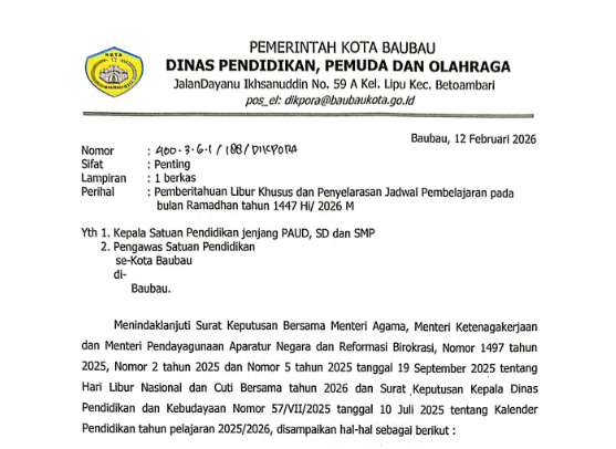Perihal : Pemberitahuan Libur Khusus dan Penyelarasan Jadwal Pembelajaran pada bulan Ramadhan tahun1447 H/ 2026 M